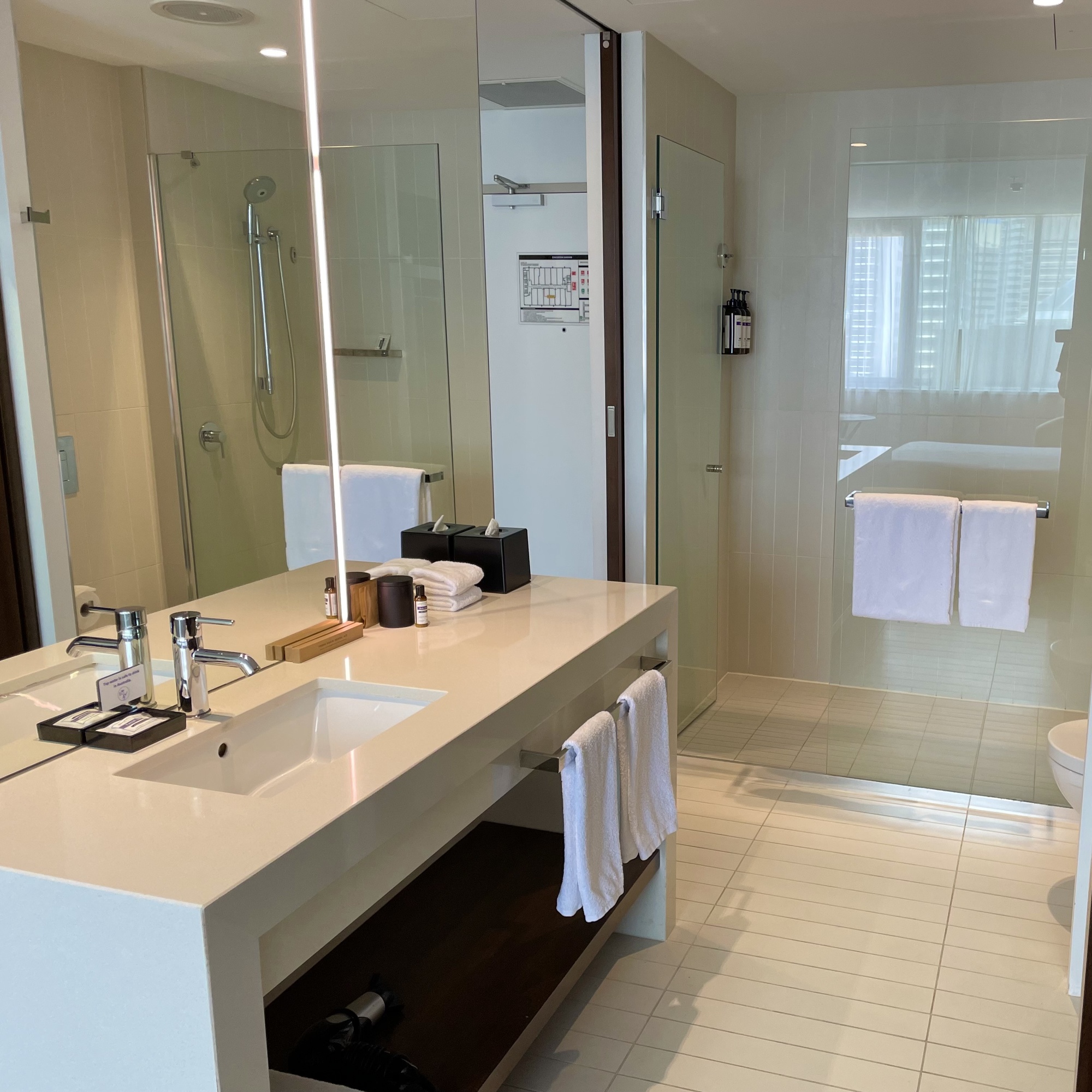 The adage goes, never judge a book by its cover. The same could be said for the Hyatt Regency; with its odd shape, small windows and charcoal coloured exterior walls; it gave the appearance of something out of fashion. So it was a welcome surprise to walk into a bright and airy room. The room was quite spacious with wall to wall carpet creating warmth that softened the acoustics. A large TV commanded a wall overlooking the king size bed. But a significant feature of this room layout was the bathroom with no wall. It really opened up the room giving it a roomy feel and natural light in the bathroom, now that's not something you get often in a hotel bathroom. At first I thought, "goodness, no wall; that's awkward!" But after further investigation I discovered a sliding wall that could close off the bathroom to the bedroom. That was cool, and there was a second access point to the bathroom when the wall was closed making the bathroom accessible from another point.
