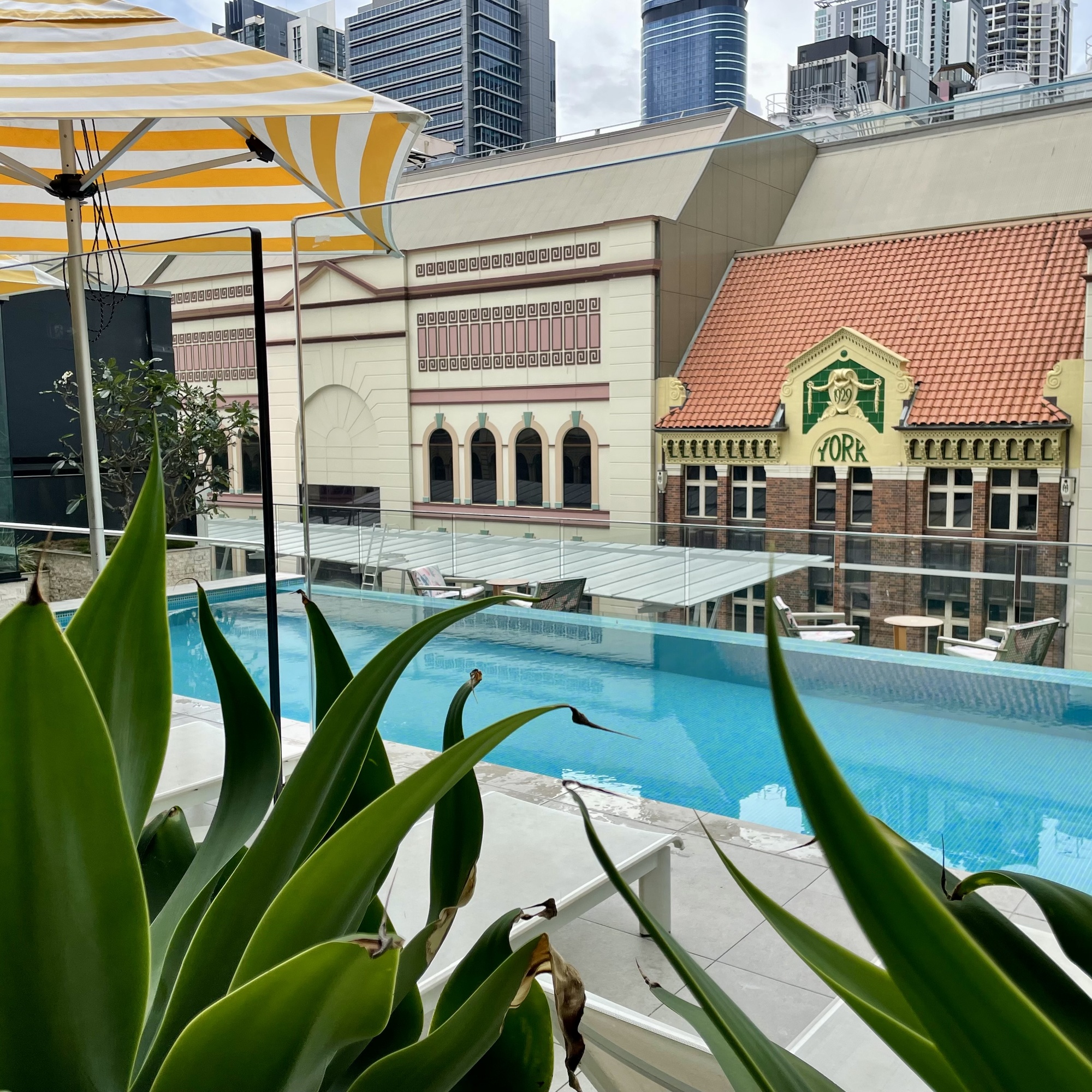 The hotel is conveniently flanked by Brisbane's Queen street Mall and Burnett Lane; giving visitors two entry points to the hotel. The latter having vehicle access for guest drop off and access to concierge and elevators to the reception. Queen street offers pedestrian access and escalators that ferry guests direct to the lobby. Adjacent to the entrance; an elevator awaits to whisk guests and the general public straight to level 4 where the famous Hibiscus bar and infinity pool is located.