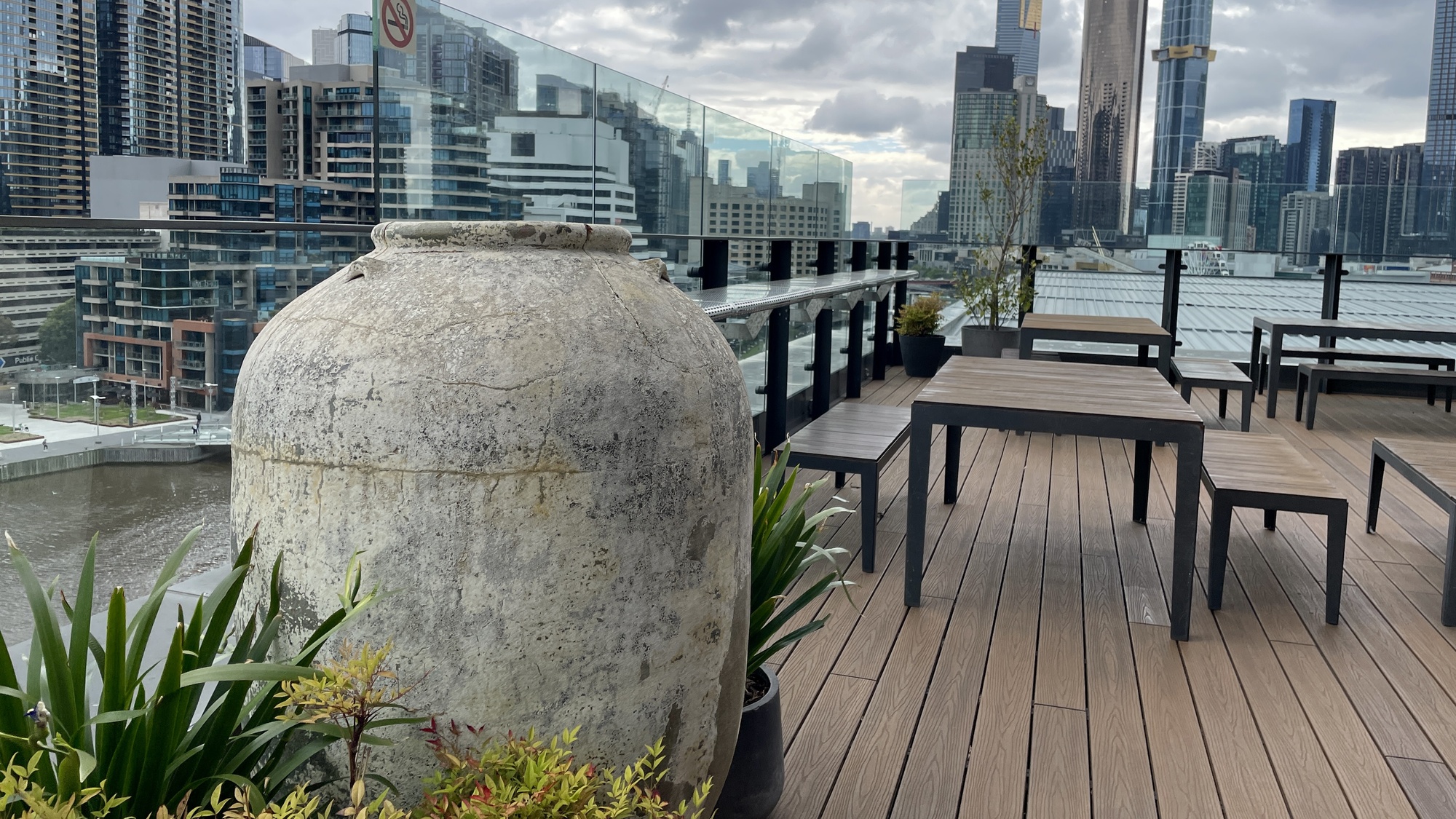 The lounge is quite expansive and the floor to ceiling windows offer views to the city skyline on three sides. The room is carpeted throughout, so it's calm and relaxing, and there's a range of lounges and chairs to sit on. I have an affliction where I have to try every seat, until I find the right one that's; comfortable, has good support, a nice view and perfect side table to put my glass of wine on. Thankfully this lounge addresses that hang up! When I need fresh air this hotel offers something few others do and outdoor deck 5 storeys up above the Yarra river. Melbourne weather pending this vantage spot has outdoor tables and chairs with views east and west down the Yarra, it's beautiful in the evening with the city lights.
